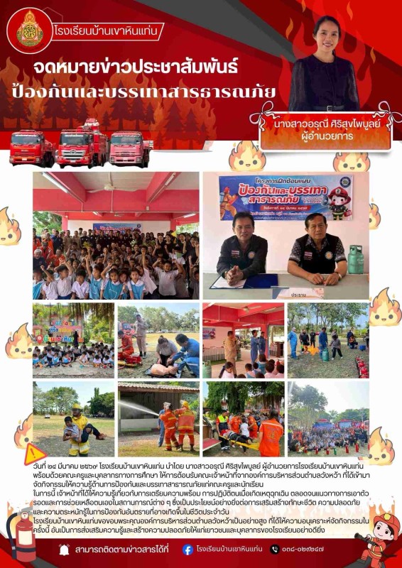 วันที่ ๒๔ มีนาคม ๒๕๖๙ โรงเรียนบ้านเขาหินแท่น นำโดย นางสาวอรุณี ศิริสุขไพบูลย์ ผู้อำนวยการโรงเรียนบ้านเขาหินแท่น พร้อมด้วยคณะครูและบุคลากรทางการศึกษา ให้การต้อนรับคณะเจ้าหน้าที่จากองค์การบริหารส่วนตำบลวังหว้า ที่ได้เข้ามาจัดกิจกรรมให้ความรู้ด้านการป้องกันและบรรเทาสาธารณภัยแก่คณะครูและนักเรียนในการนี้ เจ้าหน้าที่ได้ให้ความรู้เกี่ยวกับการเตรียมความพร้อม การปฏิบัติตนเมื่อเกิดเหตุฉุกเฉิน ตลอดจนแนวทางการเอาตัวรอดและการช่วยเหลือตนเองในสถานการณ์ต่าง ๆ ซึ่งเป็นประโยชน์อย่างยิ่งต่อการเสริมสร้างทักษะชีวิต ความปลอดภัย และความตระหนักรู้ในการป้องกันอันตรายที่อาจเกิดขึ้นในชีวิตประจำวันโรงเรียนบ้านเขาหินแท่นขอขอบพระคุณองค์การบริหารส่วนตำบลวังหว้าเป็นอย่างสูง ที่ได้ให้ความอนุเคราะห์จัดกิจกรรมในครั้งนี้ อันเป็นการส่งเสริมความรู้และสร้างความปลอดภัยให้แก่เยาวชนและบุคลากรของโรงเรียนอย่างดียิ่ง |