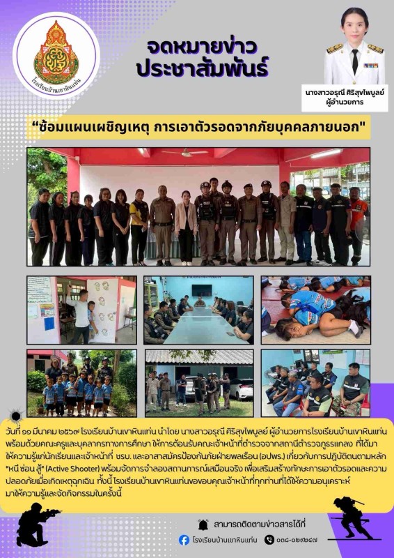 วันที่ ๑๑ มีนาคม ๒๕๖๙ โรงเรียนบ้านเขาหินแท่น นำโดย นางสาวอรุณี ศิริสุขไพบูลย์ ผู้อำนวยการโรงเรียนบ้านเขาหินแท่น พร้อมด้วยคณะครูและบุคลากรทางการศึกษา ให้การต้อนรับคณะเจ้าหน้าที่ตำรวจจากสถานีตำรวจภูธรแกลง ที่ได้มา ให้ความรู้แก่นักเรียนและเจ้าหน้าที่ ชรบ. และอาสาสมัครป้องกันภัยฝ่ายพลเรือน (อปพร.) เกี่ยวกับการปฏิบัติตนตามหลัก “หนี ซ่อน สู้” (Active Shooter) พร้อมจัดการจำลองสถานการณ์เสมือนจริง เพื่อเสริมสร้างทักษะการเอาตัวรอดและความปลอดภัยเมื่อเกิดเหตุฉุกเฉิน ทั้งนี้ โรงเรียนบ้านเขาหินแท่นขอขอบคุณเจ้าหน้าที่ทุกท่านที่ได้ให้ความอนุเคราะห์มาให้ความรู้และจัดกิจกรรมในครั้งนี้ |
